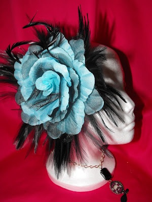 Brooch or Hair clip, black feathers and a couple Peacock feathers with a few small polka dot feathers, on a black satin wrapped silk flower with a crystal like jewel for a vintage flair.